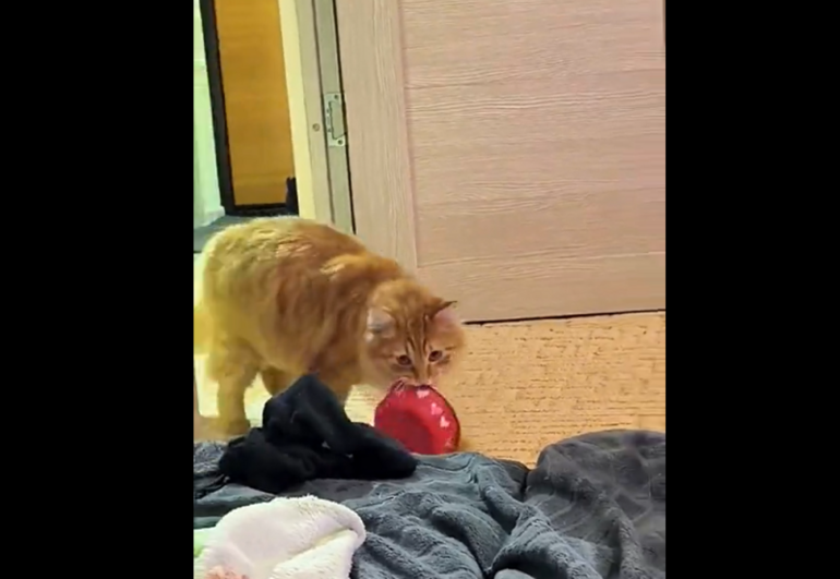 Котик пристыдил свою хозяйку. Принес свою миску ей в кровать...